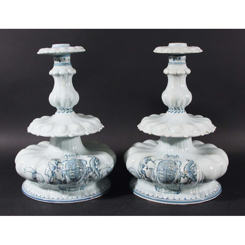PAIR OF CANTAGALLI MAIOLICA CANDLESTICKS, 20th century, of foliate, lobed, middle eastern form, blue painted with the arms of Lord Somerset, Duke of Beaufort, height 31cm (2)