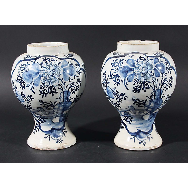 PAIR OF DELFT VASES, mid/late 18th century, of inverted baluster form, blue painted with Chinoiserie garden scenes in cartouches, height 17cm (2)
