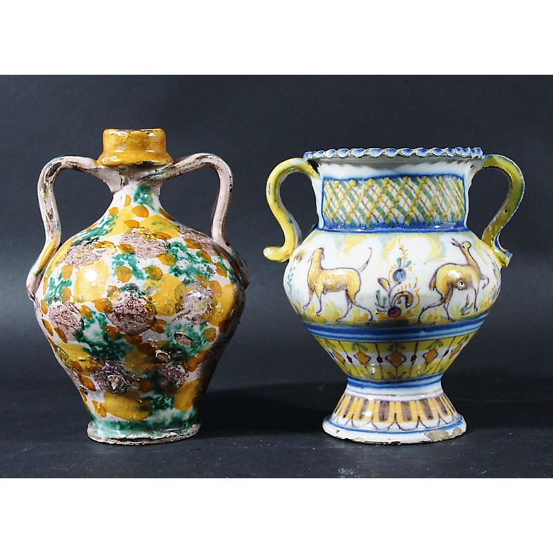 mid 19th century, of two handled form decorated in typical maiolica colours with scenes of bull fighting and deer, height 16.5cm; together with an Iberian two handled flask, sponge decorated in ochre, manganese and green, height 18cm (2)