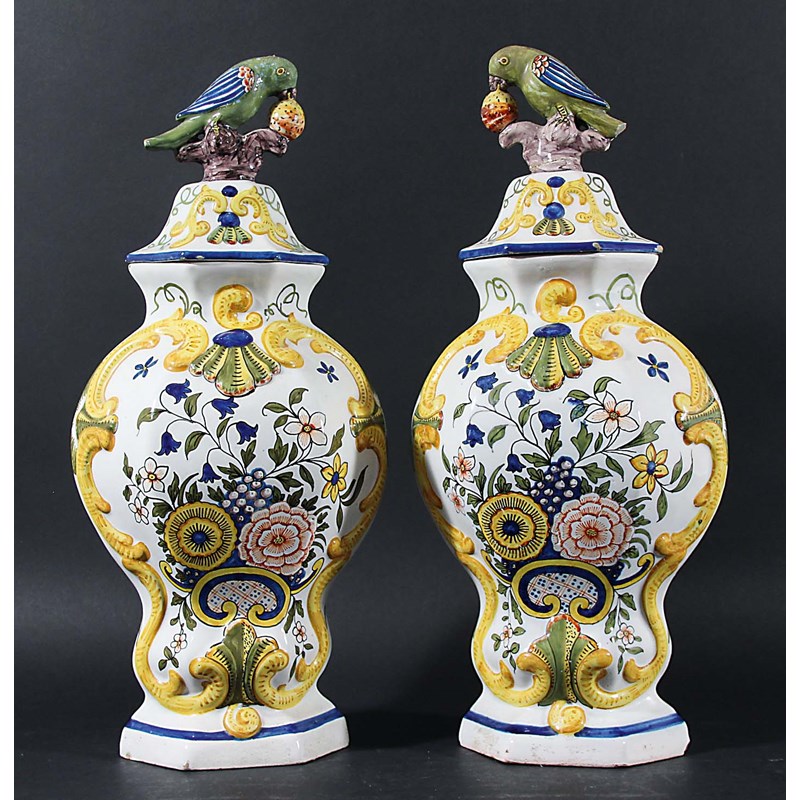 late 19th century, of flattened hexagonal section, painted with flowers between moulded, scrolling frames, the covers with parrot finials, HB to base, height 38cm (2)