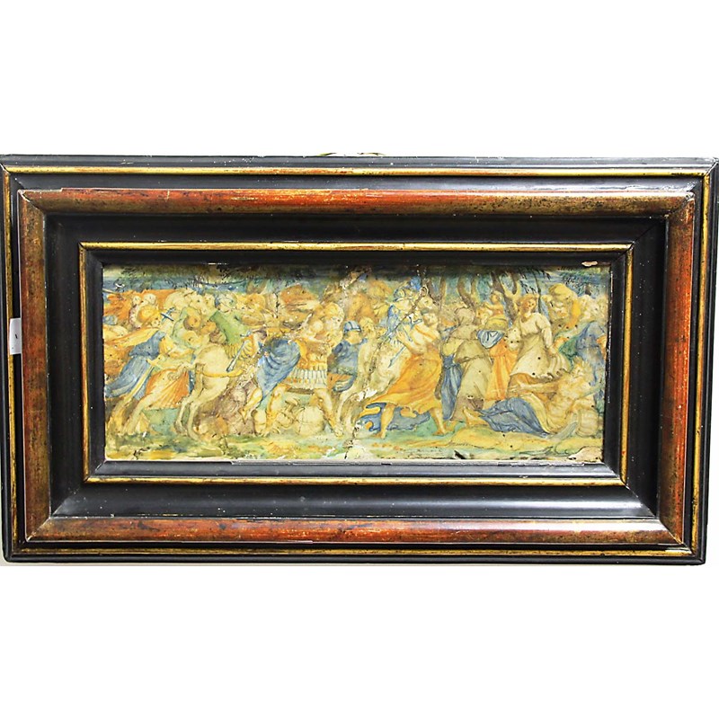 ITALIAN MAIOLICA PLAQUE, possibly Castelli and late 17th century, painted with a version of The Rape of the Sabine Women, framed, 18cm x 45cm
