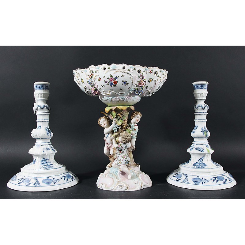 circa 1800, of 'silver' form blue painted in the onion pattern, blue crossed sword and star mark, height 24cm; together with a Meissen style centrepiece, blue factory mark, height 26cm (3)