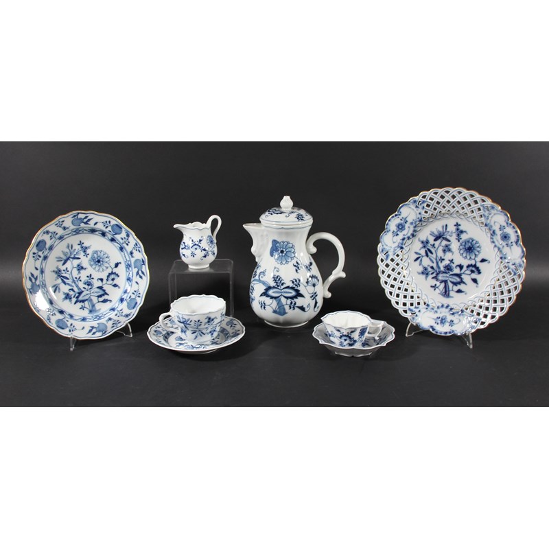 MEISSEN ONION PATTERN PART SERVICE, various dates, comprising plates and bowls in various sizes, tea and coffee cups and saucers and an oval platter, blue crossed sword marks (70 approx)
