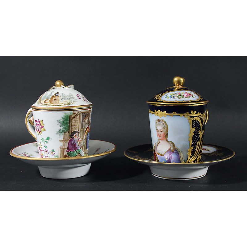 a painted portrait of Duchess du Barry on a deep blue round with floral cartouches, interlinked Ls, diameter of saucer 17cm; together with a Lille faience chocolate cup, cover and trembleuse saucer, painted with rural scenes, printed mark, diameter of saucer 16.5cm (2)