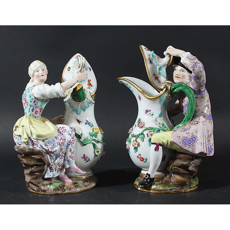 PAIR OF MEISSEN FIGURES, late 19th century, modelled as a man and woman seated beside an oversized lidded jug, painted and encrusted floral decoration, blue crossed sword, incised and impressed marks, height 19cm (2)