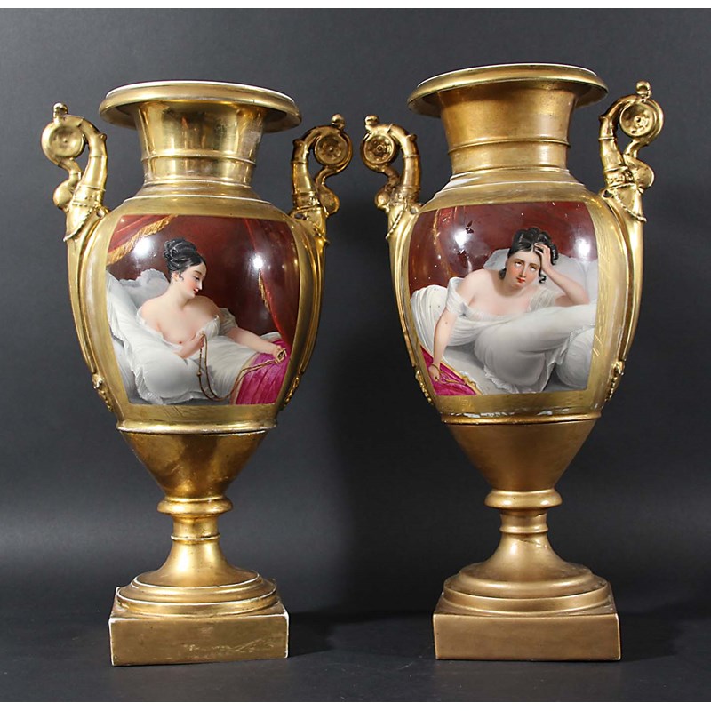 PAIR OF FRENCH EMPIRE STYLE VASES, 19th century, painted with portraits of scantily clad ladies reclining on beds, on gilt ground and between scrolling handles, height 42.5 (2)