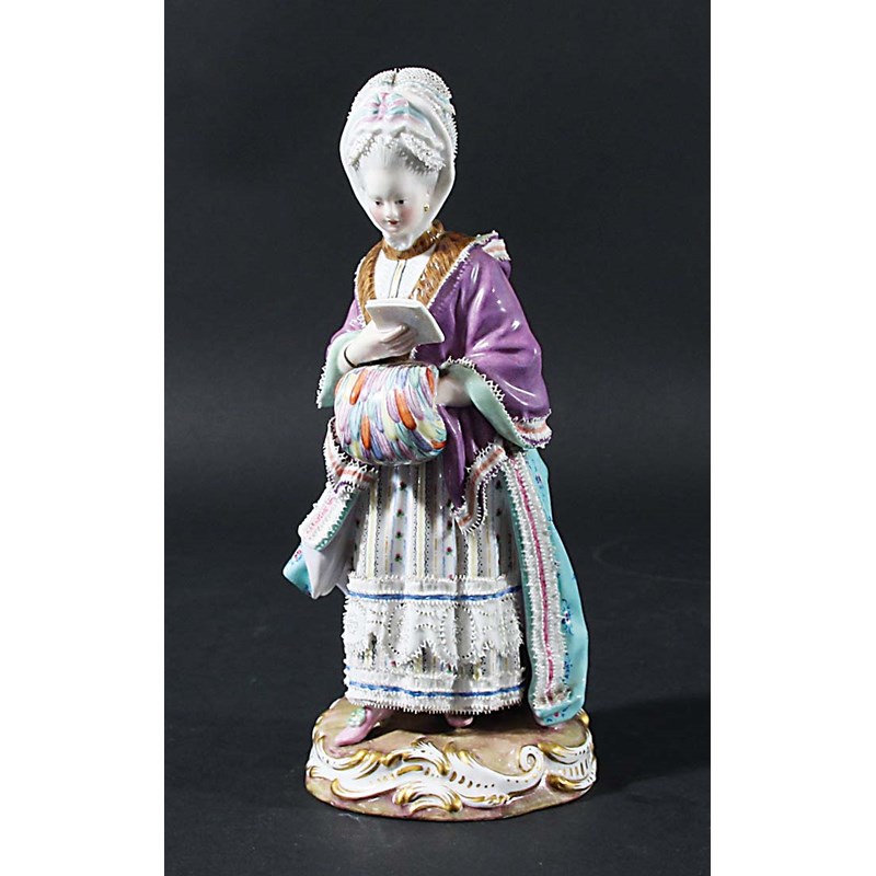 MEISSEN FIGURE OF A LADY, late 19th century, holding a letter and a muff, blue crossed sword and incised marks, height 21cm