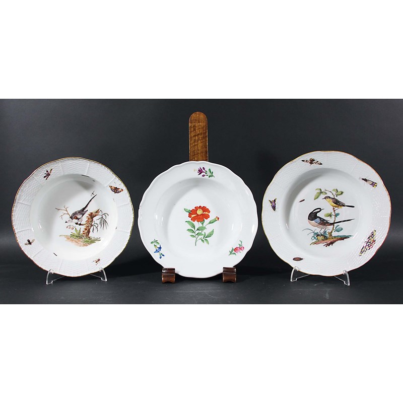 GROUP OF SIX MEISSEN ORNITHOLOGICAL PLATES, late 19th century, painted with various birds and insects inside basket weave borders, blue crossed sword marks, diameter 25cm and smaller; another similar with foliate decoration, together with a Meissen plate outside decorated with flowers, cancelled blue crossed sword mark, diameter 23cm (8)