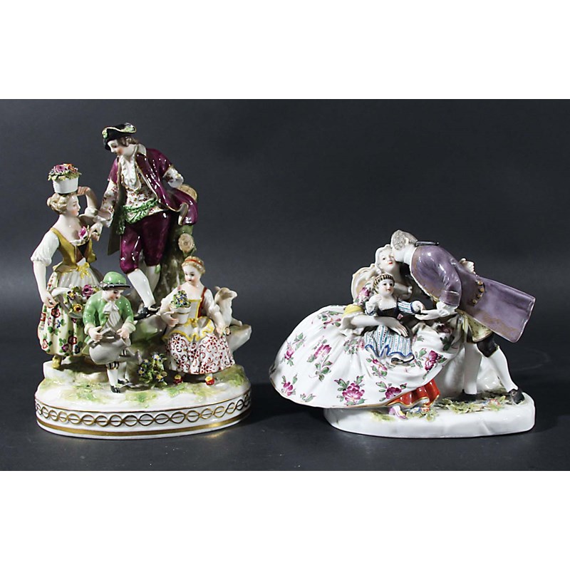 TWO LUDWIGSBURG STYLE GROUPS, early 20th century, the first modelled as a farming family, the second as a family seated on a chair, blue factory marks, height 21cm and smaller (2)