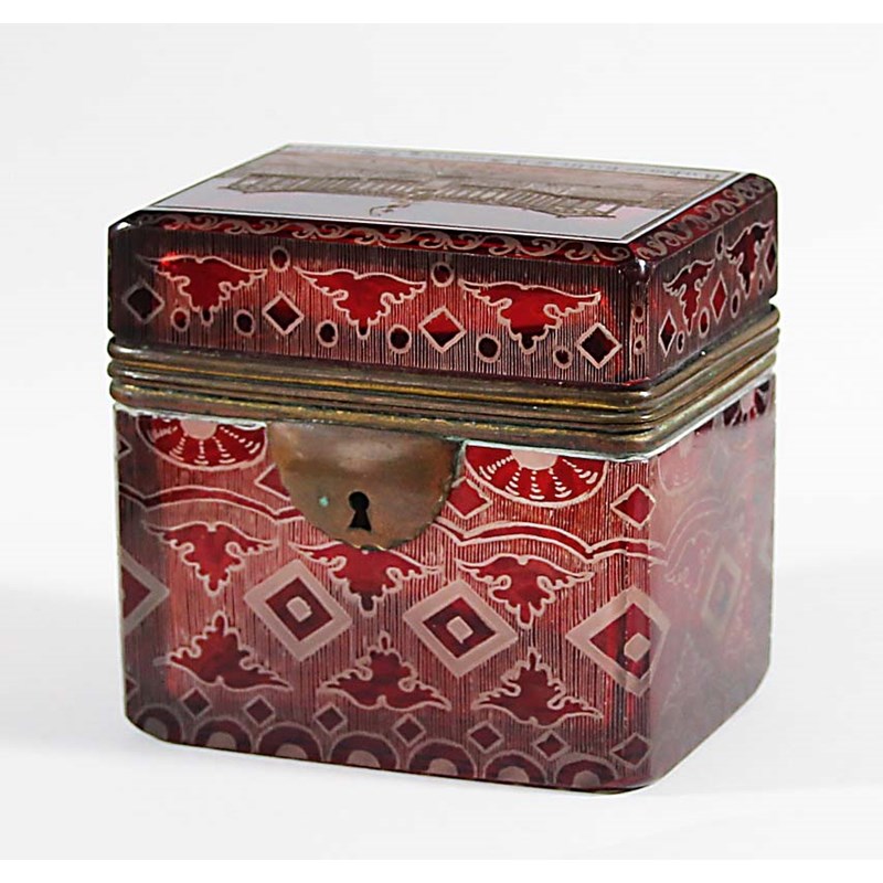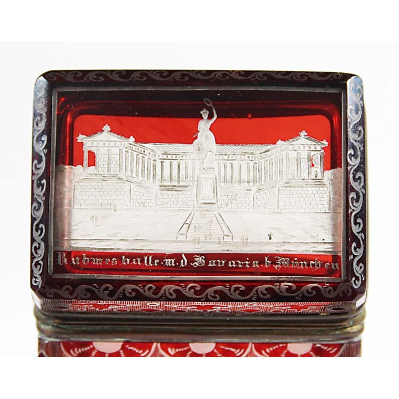 19th century, red cut through to clear with a view titled Ruhmeshalle Bavaria Munchen to the cover, stylised designs to the sides, gilt metal mounts, height 8.5cm, width 9cm, depth 6.5cm