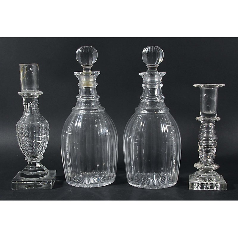 the three ring neck above a faceted, bulbous body and star cut base, with orb stoppers, height 27cm; together with two glass candlesticks, early 19th century (4)