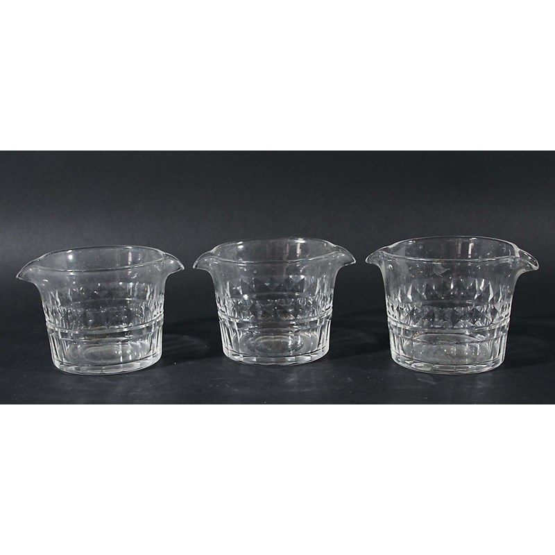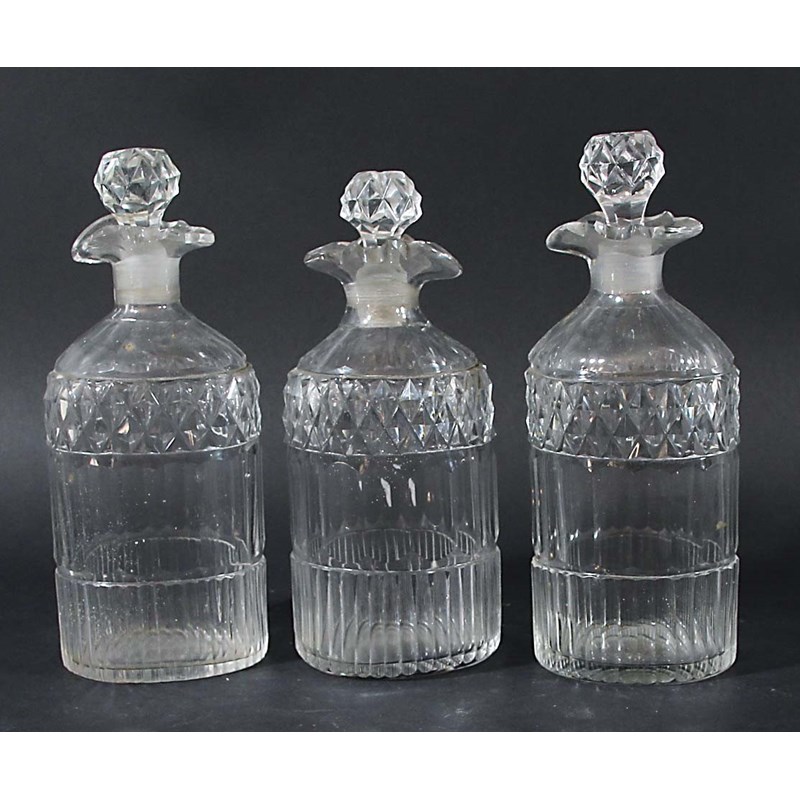 perhaps late 18th century, double lipped, with bands of diamond and faceted decoration, diameter 10.5cm; together with a set of three spirit decanters and stoppers with similar decoration (9)