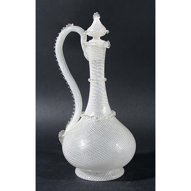 VENETIAN STYLE LATTICINO GLASS EWER AND STOPPER, of globe and shaft form, the body with fine white enamel decoration and clear glass frills, height 26cm
