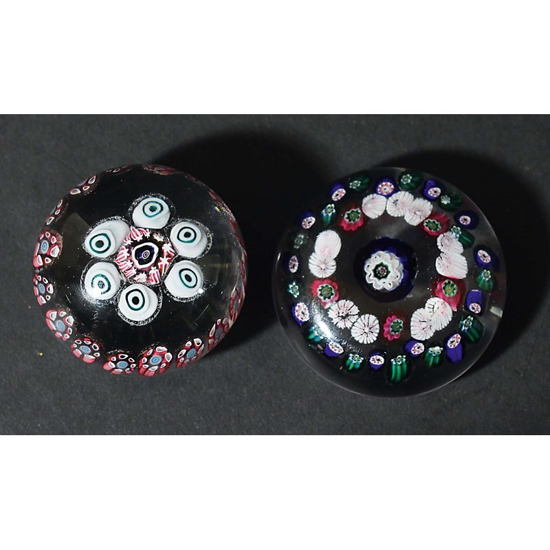 possibly Baccarat, a large central cane inside a double band of canes, diameter 5cm; together with another small weight with a central red, white and blue star and stripes style cane, diameter 4.5cm (2)