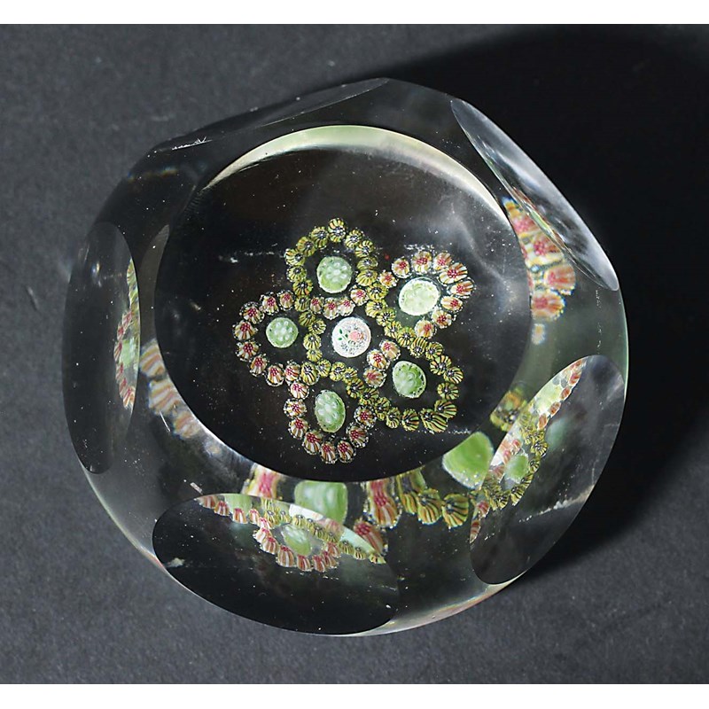 FRENCH FACETED PAPERWEIGHT, a central flower cane inside a cinquefoil garland of millifiori, diameter 7.5cm