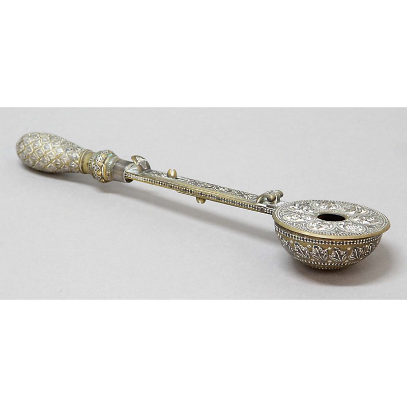 late 19th century, the hemispherical burner with hinged cover, on a sliding handle and baluster handle, length 27.5cm