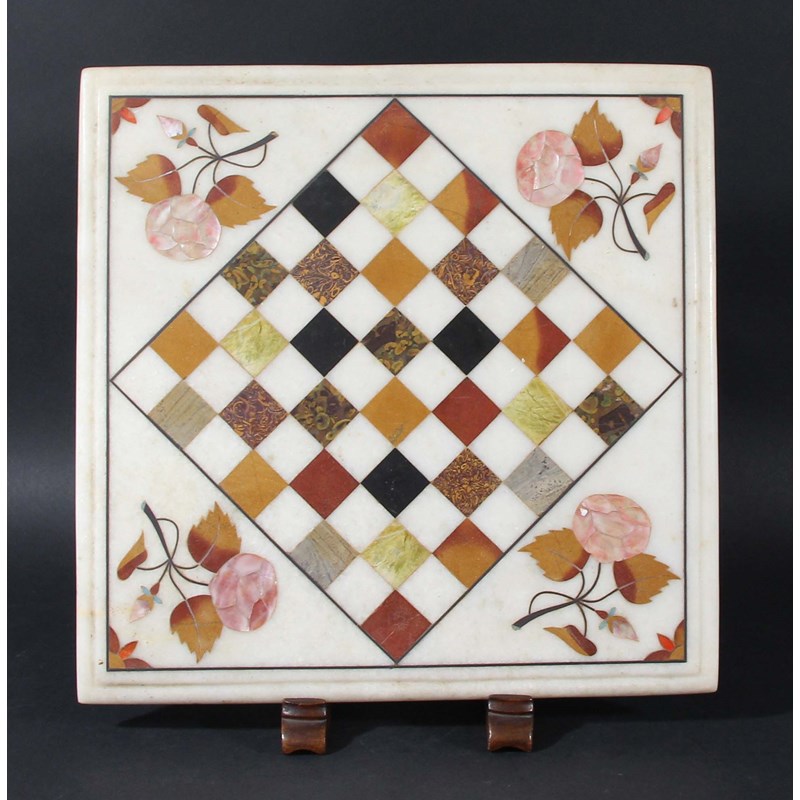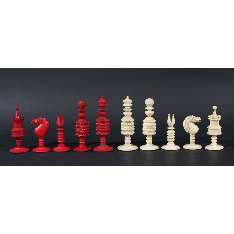 INDIAN IVORY CHESS SET, late 19th century, natural and stained red, height of king 9.5cm, height of pawn 4.5cm; together with an Agra style alabaster and specimen stone inlaid chess board, 34.5cm square (33)