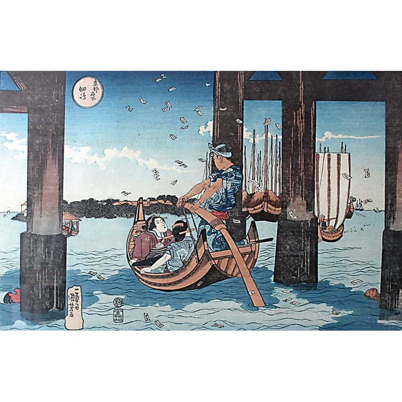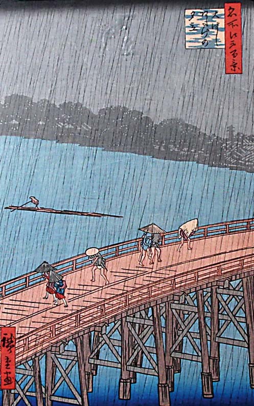 AFTER HIROSHIGE, 'Sudden Shower Over Ahashi Bridge', from One Hundred Famous Views of Odo, Japanese woodblock print, 31cm x 20.5cm; together with three further Japanese woodblock prints (4)