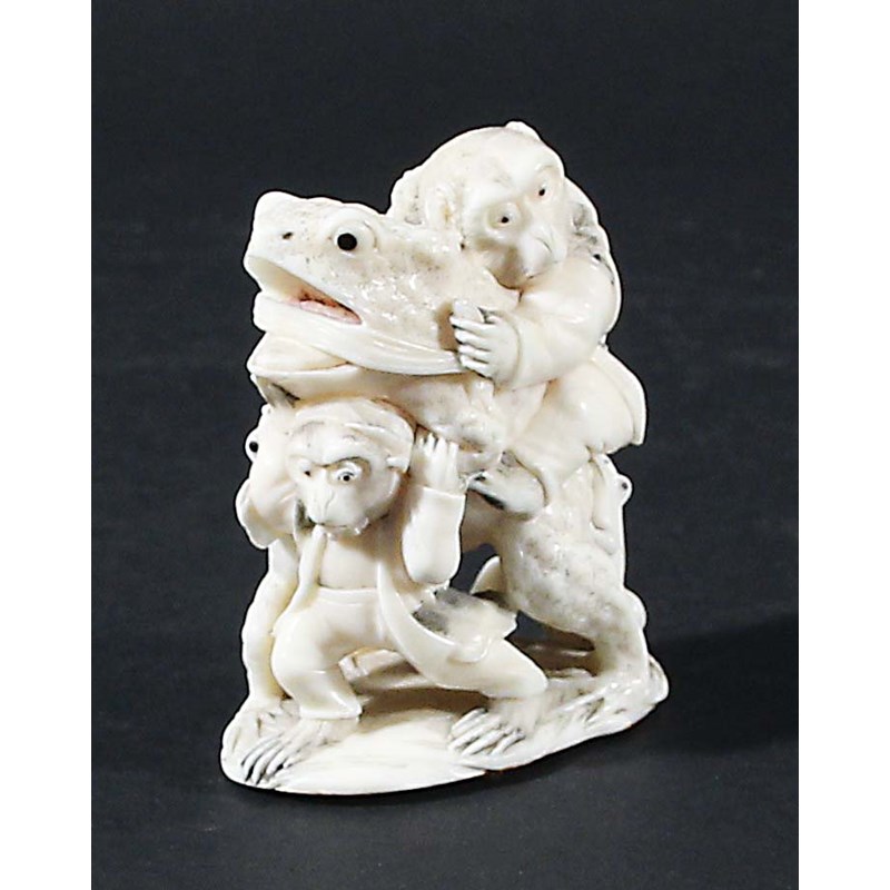 JAPANESE IVORY OKIMONO, late 19th century, carved as a monkey riding a frog or toad being supported by two further toads and a monkey, two character signature to the base, height 7cm