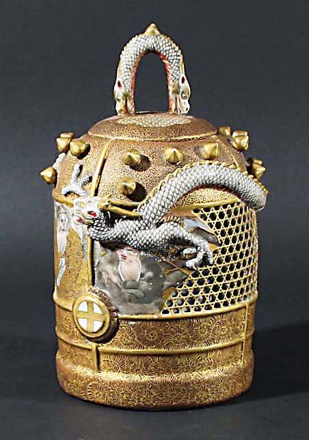 Meiji, the pierced body with a scrolling dragon in high relief beneath studs, painted and gilded with figures, scrolling and wrigglework, the inner vase painted with butterflies, the pierced cover with a double headed dragon handle, gilt marks to base, height 19cm (2)