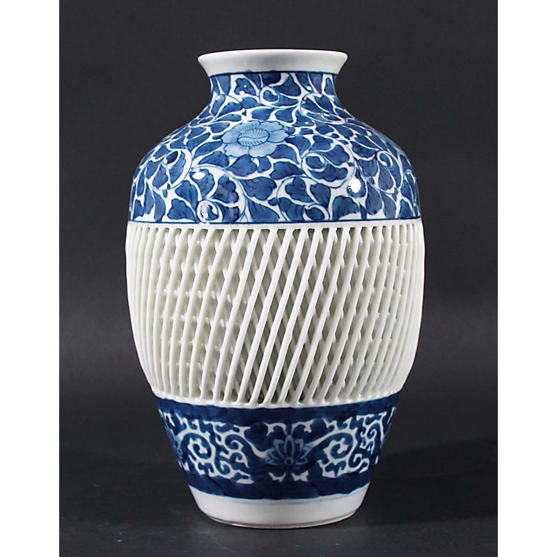 JAPANESE BLUE AND WHITE VASE, 20th century, of ovoid form with a broad band of lattice work between shoulders and foot with scrolling floral decoration, signature to base, height 22cm