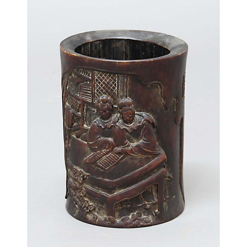 CHINESE BAMBOO BRUSH POT, carved with two figures reading, the reverse with a four line inscription and other signatures, height 23cm