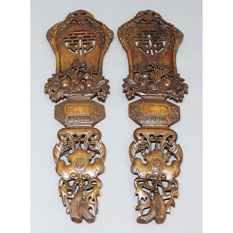 PAIR CHINESE HARDWOOD PANELS, with carved and pierced decoration, a winged bat above an elemental symbol, fruit, leaves etc, height 103cm (2)