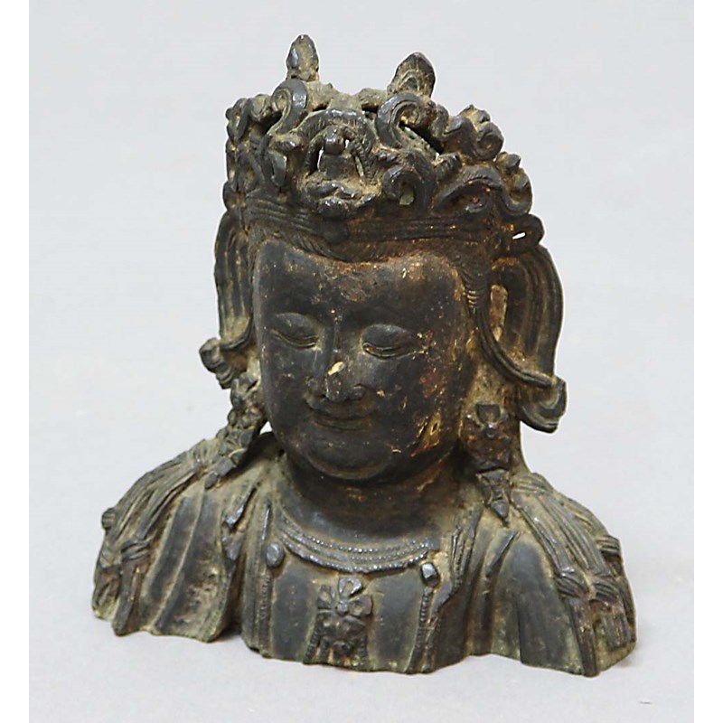 BRONZE BUST OF A BUDDHA, probably Tibetan or Chinese, cast with an elaborate head piece and closed eyes, height 14.5cm