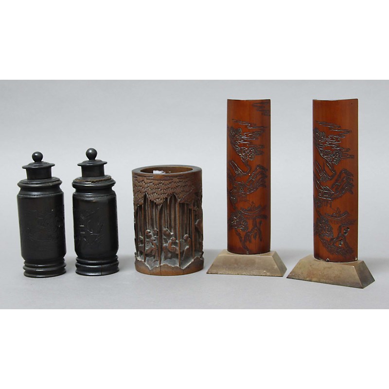 carved with scholars amongst trees, height 14cm; together with a a pair of bamboo wrist rests with mountain landscape scenes and a pair of bamboo pots and covers with carved inscription (5)