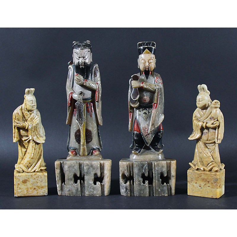 of immortal standing, with applied colouring, height 25cm; together with another pair of stone figures carved as figures with top knots, height 17.5cm (4)