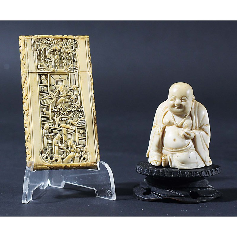 19th century, carved with a scene of figures amongst trees and pagoda, the reverse with a similarly carved cartouche, 8.5cm x 4.5cm; together with a carved ivory figures of a seated buddha, height excluding base 5cm (2)