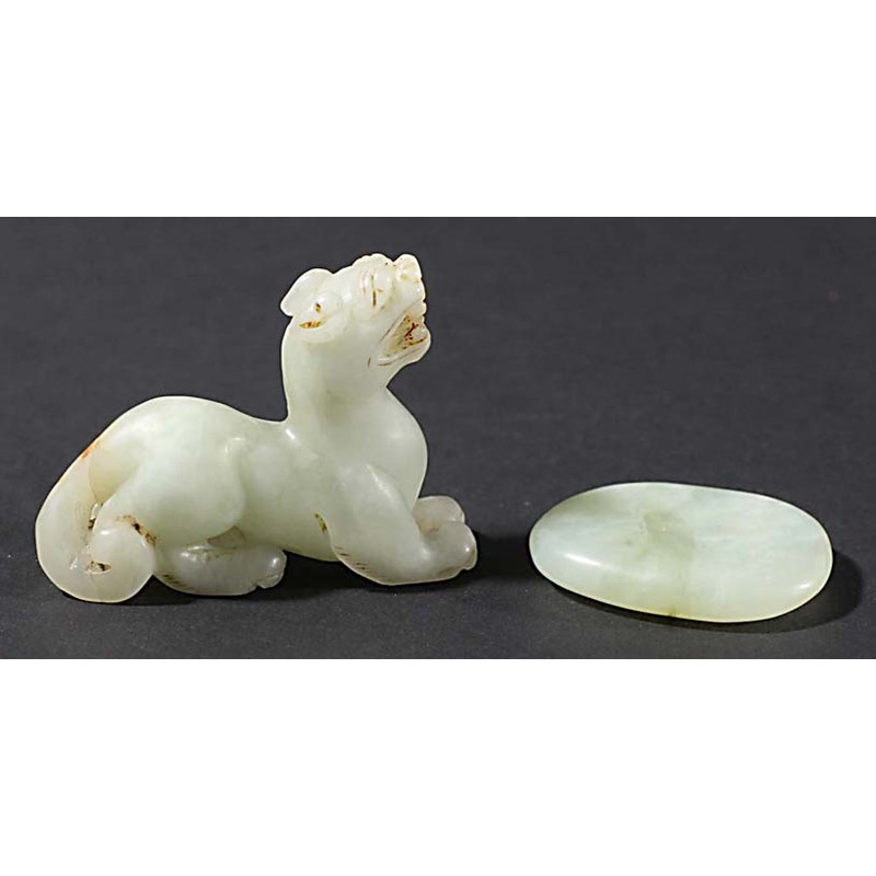 CHINESE PALE CELADON JADE CHILONG, seated, with bifurcated tail, length 6.5cm; together with an oval plaque, length 4cm (2)