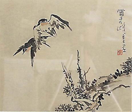 ATTRIBUTED TO PAN TIANSHOU, Two birds in flight over a landscape, ink on paper, signature and red seal mark, 25cm x 30cm