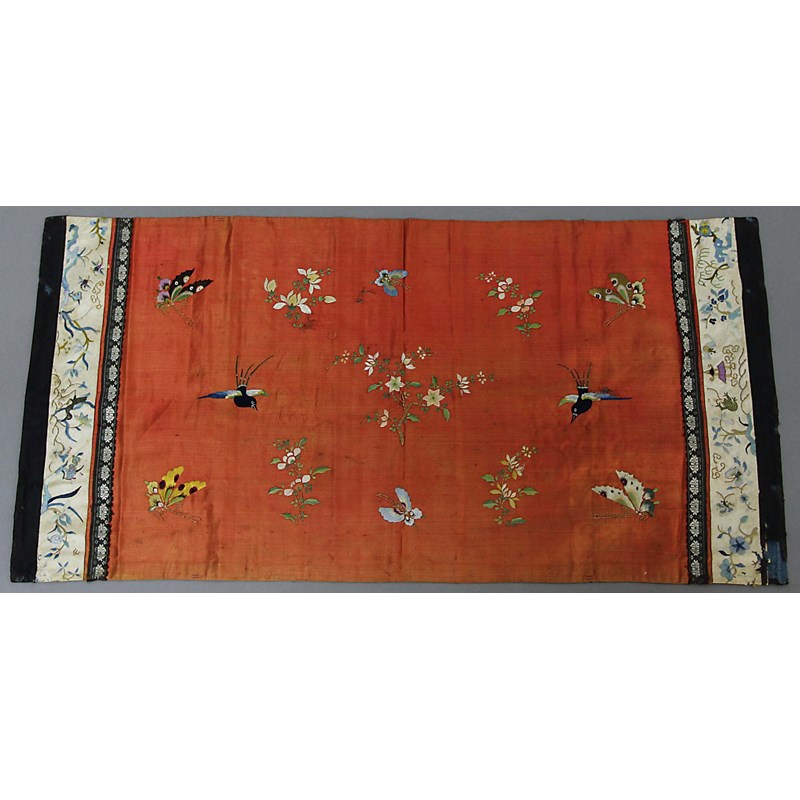 late 19th century, worked with birds and butterflies on a rust orange ground in silks and gilt wires between foliate borders, 69cm x 35cm