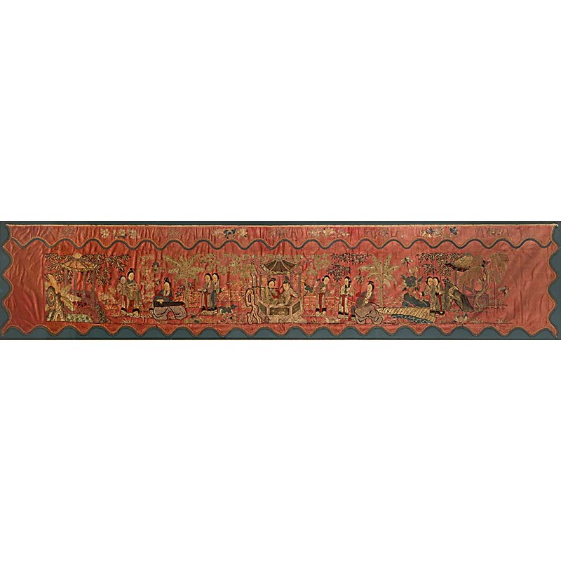 CHINESE SILK AND EMBROIDERED PANEL, probably 19th century, worked in silks and metal threads with a scene of figures conversing and playing music in a garden, panel height 35cm, width 178cm
