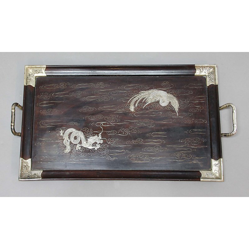 CHINESE ROSEWOOD AND SILVER INLAID TRAY, circa 1900, inlaid with a dragon and phoenix amongst scrolling clouds, hallmarks to handle mounts, length 70cm, width 38cm