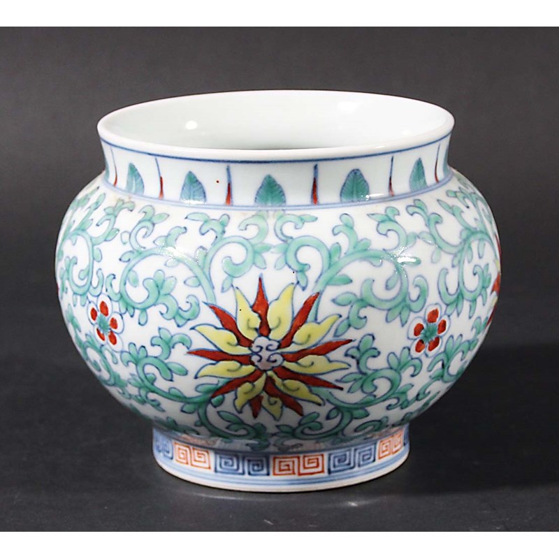 CHINESE DOUCAI VASE, of ovoid form, decorated with flowerheads on a scrolling foliate ground, above a greek key foot, diameter 13cm