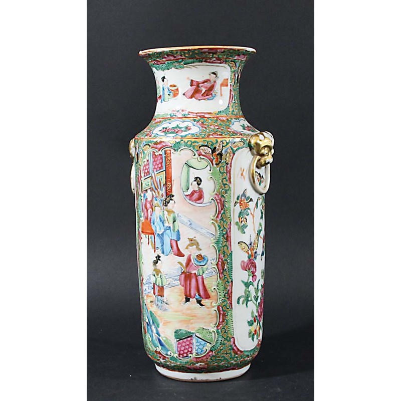 CHINESE CANTON VASE, enamelled in the famille rose palette with genre interior scenes between panels of flowers and butterflies, height 29cm