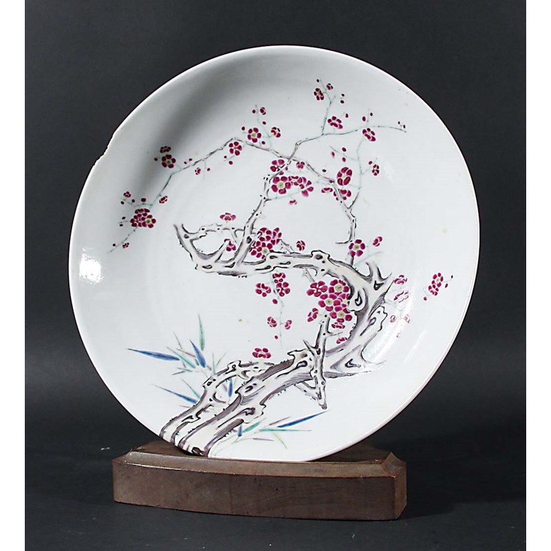 CHINESE SAUCER DISH, Kangxi style but possibly Republican, enamelled with a flowering prunus tree and bamboo, the reverse with training flowers, six character Kangxi mark inside scrolling enamelled dragons, diameter 28.5cm