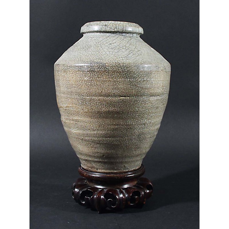 CHINESE CRACKLE GLAZE VASE, Guan style, of shouldered form under a grey, crackle glaze, with a hardwood stand, height 22cm