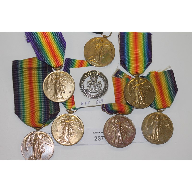 (7) Gt War Victory Medals named to 1. 215757 Spr W H Davis RE. 2, 145028 2 A M E H Day RAF. 3. 20672 Pte G House Som LI. 4 250795 3 A M W B Heigho RAF also SWB number 8491.(Awarded to 1638 George Bernard Tipton 12th Battn the London Regt who never served overseas. 5. 25492 Pte T L Thorley Ox & Bucksd L I. 6, 149279 Sjt A Banner RE. 7. 15505 Pte H E Rogers Ox & Bucks LI.