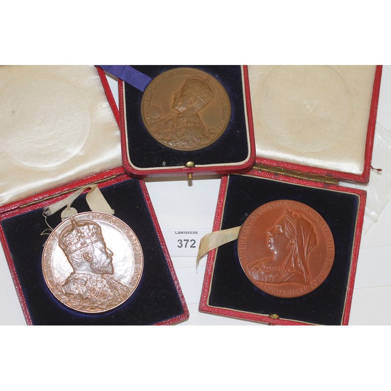 THREE CASED BRONZE MEDALLIONS. The first an 1897 Diamond Jubilee 55 mm diameter. The second a 1902 Coronation Medal 55mm diameter. The third a 50 mm diameter Coronation Medal, all three with gold lettering on the lids.