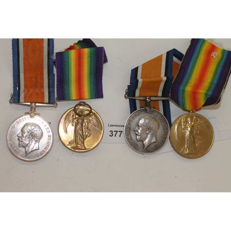 British War & VIctory Medals named to 15653 Pte E Tanner 20 Hrs. Pte Ernest Tanner served in France with his Regiment from the 21st November 1914, (he was issued with a 1914 Star). 2. 1251 Pte A R Brownlees K.Edw.H. (Alfred Brownlees) King Edwards Horse is confirmed as a pair issued, only.