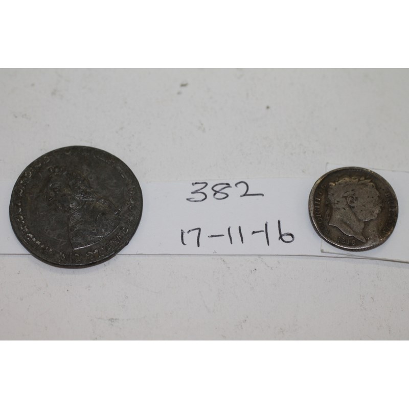 A Token of William Pitt 'Thanks to the friends of Liberty and Trade with Sailing Ship and America obverse. With reverse left facing bust. The Restorer of Commerce 1766-No Stamps. In a silvered base metal, 27mm diameter. A warped Geo 111 Sixpence dated 1816, well worn condition. (2)