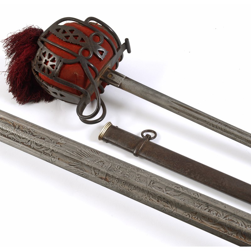 A Victorian Kings Own Scottish Borderers Broadsword with E Thurkle & Sons, Denmark St, Soho, London on the forte. The 33" double-edged blade is decorated with thistles VR and other patterns. On the centre of the blade is Nisi Dominus Trustra. (without the Lord everything is in vain ) Nec Aspera Terrant (Hardships do not deter us) below a Castle and then a Horse respectively. Kings Own Scottish Borderers below a Victorian Crown. Battle Honours from Egypt, Minden, etc up to 1878-80. Full dress hilt with red inner lining and red pommel fringe, steel pierced outer guard in its steel scabbard.