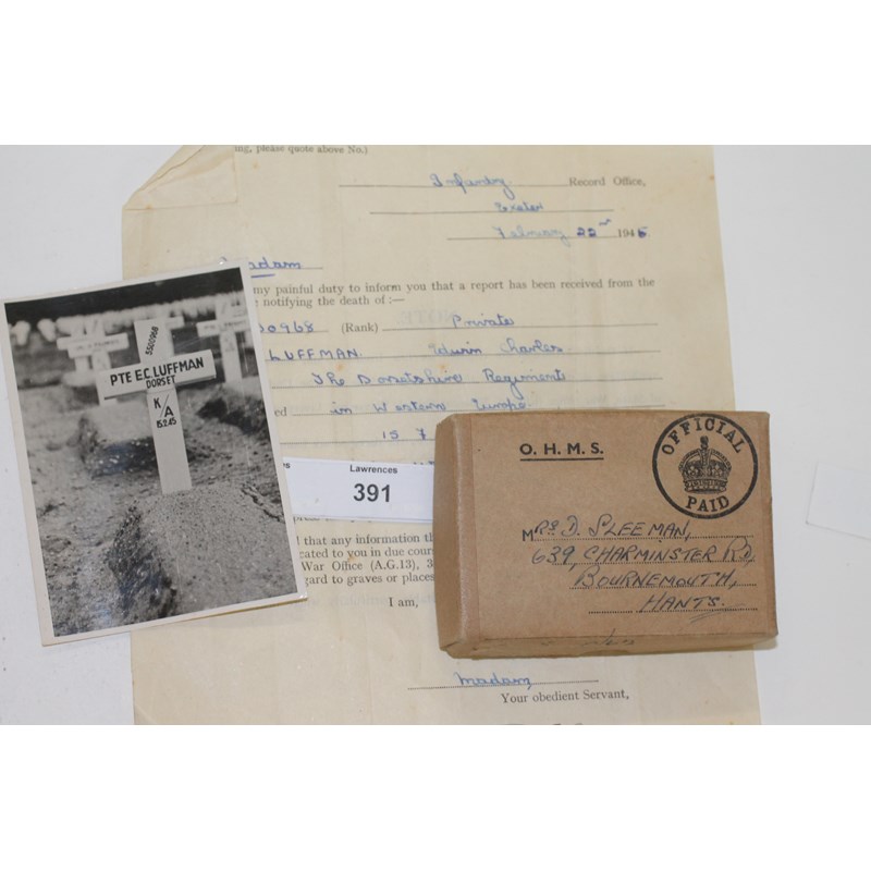 The son of Edwin Charles Frederick and Blodwin Luffman, husband of Mrs Dora May Luffman of Bournemouth Hampshire. Who later remarried and became Mrs D Sleeman, 639 Charminster Rd, Bournemouth, Hants. (Box Of Issue is addressed thus when sent to his widow.)
