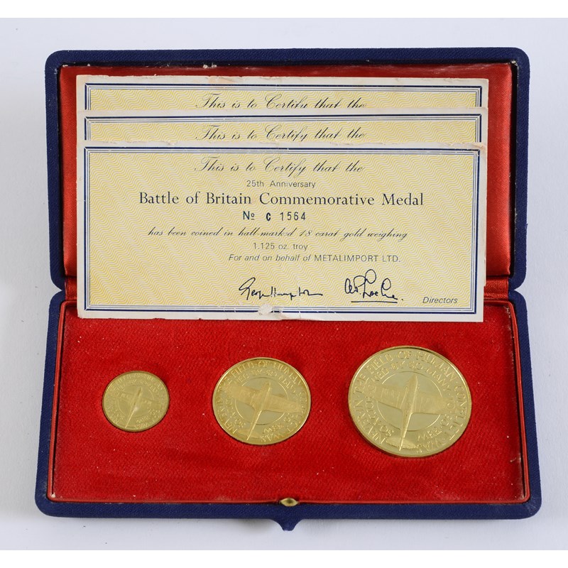 Cased 18ct gold Johnson Matthey & Co of London, Battle of Britain Commemorative Medals (3) with certificates. Three different sized medallions all hallmarked for 18ct, Commemorating 25 yrs since the Battle, with Never in the field of Human Conflict etc, on each. weighing .257 oz /.562 oz /1.125 oz seperately. The numbered certificates match the numbers on the medals, C1564-B 1555 and A 2218.