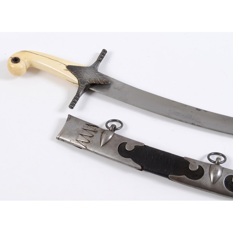 The Mameluke sword of General Sir Thomas Bradford GCB and GCH, who served under Wellington, during the Peninsula War. Plain Ivory grips with steel mounts and the owners etched details on the scabbard. 32" long curved blade, with full length broad fullers. Marked Solingen on the spine, in very clean condition overall. The scabbard of black leather and decorative steel mounts, has the following details etched at the bottom hanger mount.