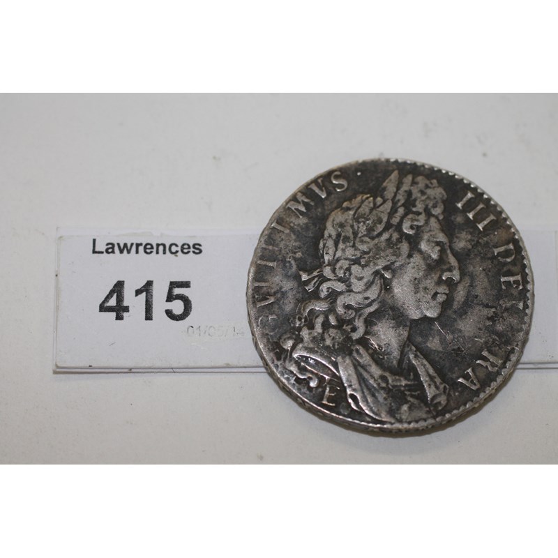 A WILLIAM 111 HALFCROWN PIECE. A William 111 Edinburgh Mint E below bust Halfcrown piece, dated 1697 the date being somewhat illegible.