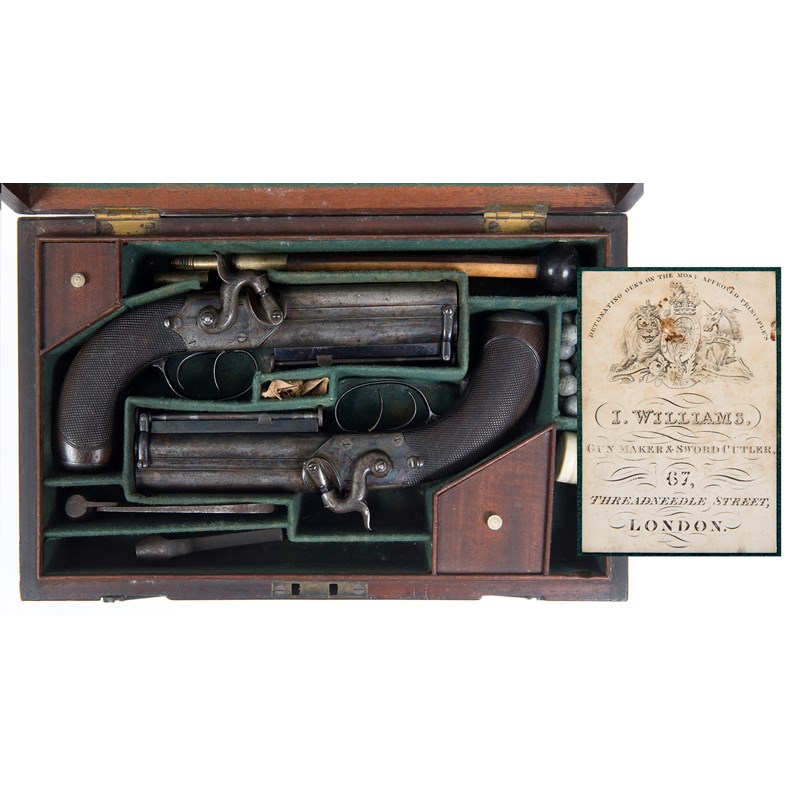 In a fitted mahogany case a pair of I Williams of 67 Threadneedle Street, London, over and under percussion pistols. Each hammer has a sliding safety in the action, with dual triggers below. Underslung swivel ramrods on the 4.1/4" steel barrels, having side ribs and flattened top with proof marks evident. Chequered grips with opening buttcaps, traces of colour hardening on the ornate actions. 9" overall length with the case containing a bullet mould, wadcutter etc.